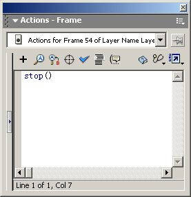 第十步:我们回到人物影片剪辑,在第50帧处使用Window|Action打开Action面板,输入代码stop()命令,这样,动画在播放到这一帧时,会停止播放,而眼泪就会一直循环播放下去。然后双击空白区域,回到场景,在场景的第590帧处按F6键,建立关键帧,放大人物的形象,然后加入代码stop(),让场景播放到第590帧时停止播放(图8)。