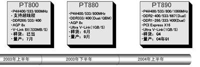 威盛在最近的CeBIT America大会上公布了旗下芯片组的最新蓝图,其中威盛会在今年下半年推出采用双通道或者QBM内存的DDR333/400的PT880芯片组,9月出货,威盛会在2004年发布PT890芯片组,最大支持1066MHz FSB,支持双通道DDR2-400/533/667内存,支持双通道DDR 266/333/400内存,支持PCI Express 16x,出货日期2004年第一季度。
