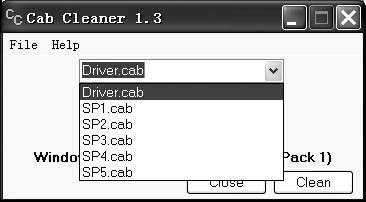在Driver Cleaner的安装文件夹中,还可以找到一款名为Cab Cleaner的工具(CCleaner.exe),主界面如图2所示,它可以卸载系统中安装的Driver.cab、SP1.cab、SP2.cab、SP3.cab等补丁包,只要从下拉列表框中选择相应的补丁包,然后点击“Clean”按钮就可以将它清除出系统了。例如选择了“Driver.cab”,那么就可以将“\windows\driver cache\i386”文件夹从系统中卸载。这对那些安装了测试版本的补丁包的朋友来说,就非常实用了。