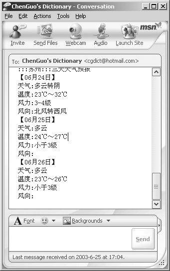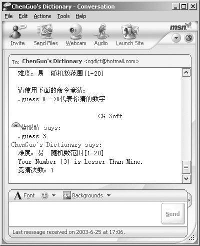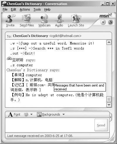 首先介绍一下用MSN Messgner来查询天气预报、玩游戏、单词翻译,只要你将“cgdict@hotmail.com”添加为联系人,就可以使用上述功能了。cgdict@hotmail.com是一种插件,与之进行第一次对话时,ChenGuo's Dictionary会向你表示欢迎。(键入“.help”可以查询所有命令)