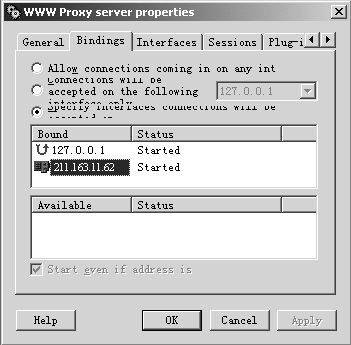 此外,我用的宽带是ADSL拨号上网,启动Wingate代理服务器的顺序最好是先用EnterNet300拨号软件建立Internet连接,然后再运行Wingate服务器软件。启动后需要手动调整一下各代理服务的“Bindings”项,打开各代理属性对话框的“Bindings”选项卡,把EnterNet300拨号获得的公网IP添加到“Bound”(已绑定的)项中,设置完成后与图1所示类似。