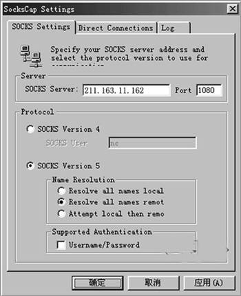 架设代理服务器的关键步骤已经完成,接下来的问题是如何通过代理点播对方的电影。由于我和小江上网时使用的都是动态分配的IP地址,因此首先必须获知对方的代理服务器的IP地址,然后在IE和Realplayer软件的代理选项中设置代理服务器的IP地址和服务端口号。默认情况下,WWW代理端口号为80,RTSP代理端口号为554。由于Wingate不直接支持MMS协议,所以Mediaplayer格式的电影通过代理点播时,需要借助一个代理服务器第三方支持软件Sockscap32。Sockscap32拥有功能强大的SOCKS调度功能,使用它几乎可以让所有基于TCP/IP协议的软件如IE、Realplay、Mediaplayer等都能通过Socks代理服务器连接到因特网。启动SocksCap32,运行File菜单中的Settings项进行代理设置,如图2所示。