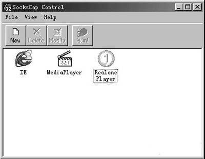 接下来单击SocksCap32面板中的New钮,将要运行的网络软件(如IE、Realplay、Mediaplayer等)添加到程序窗口中。设置完成后界面如图3。以后我们若想使用代理上网,不需在其他网络软件中做任何代理设置,只要运行SocksCap32,直接双击窗口中的程序图标即可。