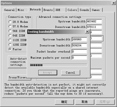 执行主菜单“Filter→Configure games…”,弹出“Options”窗口,切换到“Network”页面,点击“Auto-detect connection settings”按钮,让软件自行测试带宽(图1),完成后点击“Accept”按钮。测试期间,注意不要进行下载软件等占用带宽大的操作。考虑到网络的不稳定性,如果测试出来的数值明显偏小,请多试几次。
