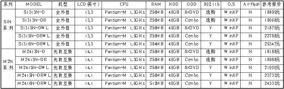 产品特色:全新外观,类似I-Book。200nits的高亮度屏幕,超大的电池容量和超常的电池寿命──4300mA/6h。轻薄全内置,仅重2.2公斤。无线上网。