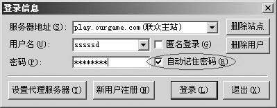 原理:有些游戏在登录时提供了“自动记住密码”功能,如果用户登录时选中过此功能选项,电脑就会自动将账户和密码保存在一个文件中。这时,可以用专门的软件瞬间暴力破解。比如专门针对联众游戏的“联众密码窥视器”,可以查看曾经选中过“自动记住密码”选项(图1)的本地登录账户及密码。