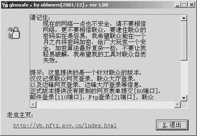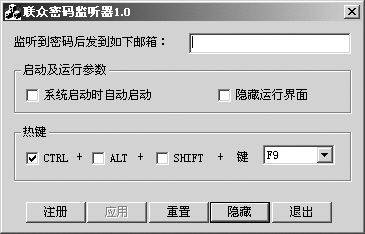 原理:此类木马一般通过捆绑于某些常用软件(其中尤以捆绑在相应的游戏外挂中居多)的方式植入,当用户打开这些软件时,木马就会随之运行,实时监听游戏账户和密码的输入,并将记录结果悄悄发送至指定邮箱。此类针对性强的木马很多,如专门针对联众的就有联众盗号机、联众密码监听器(图2)等,可以监听包括网页和联众世界客户端软件在内的的登录密码,并将监听到的密码发送到指定的邮箱;针对传奇的更多,如传奇黑眼睛、传奇密码终结者、传奇猎手等,它们能截取传奇登录区域、用户名、密码及修改密码、注册新用户里的所有信息并将它们发送到指定信箱,甚至还能自动过滤私服与重复记录;针对边锋的有边锋盗号机、边锋密码截取、边锋密码杀手等;针对中国游戏中心的有中游盗号机等。