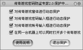 防守:对于此类专门的木马程序,一般的措施已经无法有效防止,而且由于网吧对“Ctrl+Alt+Del”组合键等的限制,使得用户根本无法知道是否有此类木马运行。不过“道高一尺,魔高一丈”,用户同样也可以去下载专门的密码保护软件来保护自己。如传奇密码防盗专家v2.0(下载地址:http://www.8864.net/down/list.asp?id=9738),用户只要在运行传奇前先运行它,就可以防止绝大部分专门针对传奇的木马窃听(图3)。