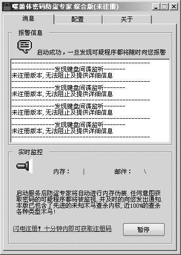 也可以去下载专业的通用密码保护软件,这里推荐噬菌体密码防盗专家v7.0(下载地址:http://www.skycn.com/soft/8380.html)。只要在运行游戏前,先运行此软件(图4),就能比较全面地保护你的各种账户和密码。该软件不但能对账号进行密码保护,还能实时诱捕各种隐蔽的病毒、木马、密码间谍、键盘记录、恶意外挂,更能在这些木马程序发送密码邮件时截获其所使用的邮件账号、密码!它使用先进的内存伪装技术,能对内存中的密码框进行动态伪装,让你能在各种场所都能放心地输入和使用账号、密码。它可以对付冰河、QQ密码侦探、广外幽灵、边锋盗号机、传奇击键、qqspy、OICQ密码监听记录工具、qeyes潜伏猎手、密码专家、传奇在线游戏击键记录、pcGhost-电脑幽灵、超级密码记录木马、联众密码监听器、按键记录器等绝大部分木马程序。