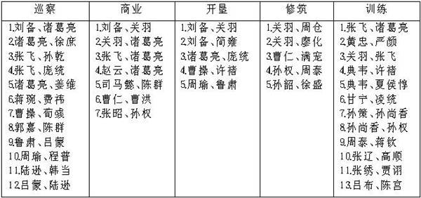 注:如有几个组合欲做同一种工作,号码靠前的优先。例:刘备、诸葛亮、徐庶三人同时去做“巡察”,刘备、诸葛亮的组合优先。