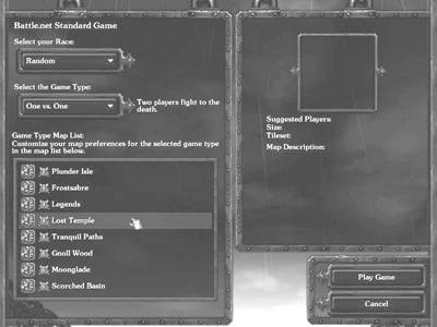 在“Select your Race”中选择自己擅长的种族,“Select the Game Type”选项保持为默认的“One vs One”,在“Game Type Map List”中选择游戏地图。一切准备就绪后,点击右下角的“Play Game”进入游戏,如图8。