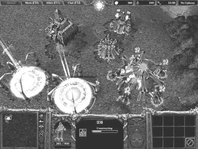 在战网自动搜索到与你等级和经验相当的玩家后,就会进入正式的比赛了。图9就是阿当在一场比赛中的开局,大家不妨本着学习的态度来研究一下。(小生:嗯,不错!建筑物的摆放起码有6个地方是有问题的,可以当做失败开局的范本。阿当:晕~,又被你识破了。)