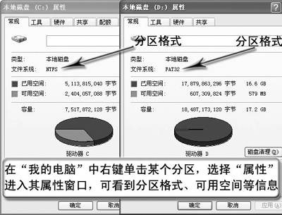 首先可以在“我的电脑”中逐一检查每个分区的格式(图1)。如果发现所有分区都是FAT32或FAT16格式,则可以通过以下方法来备份操作系统。