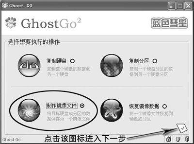 启动Ghost Go后,选中“制作镜像文件”,然后点击窗口右下角的“√”图标(图2)。