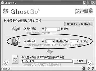 例如一块硬盘有4个分区,其中C、D、E都是NTFS格式的,而F是FAT32格式。此时如果要备份“系统”,可以在设置目标盘时设为“第1块硬盘的第1个分区”,也就是“C”盘。但在输入镜像文件的路径时,只能输入“C:\XXX.GHO”──由于Windows中的C、D、E都是NTFS格式,而备份是在DOS下进行的,此时“C、D、E”全部看不见了,而原来的“F”却成了“C”盘,因此只有在Windows中设置路径时就事先考虑好这些问题,才能避免Ghost Go在操作时出错。