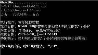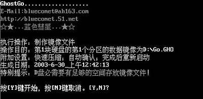例如前面在设置时我们将文件夹创建在D盘下,而命令名是“Go1”,那么只需在DOS下进入D盘,然后输入“D:\Go1\Go1”并回车,即可启动DOS下的备份向导,之后按“Y”键即可。