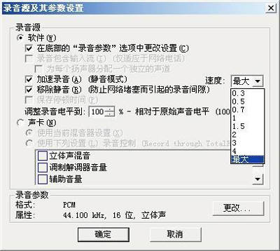 首先打开媒体播放器调入媒体文件,但不要开始播放,然后在Total Recorder界面中点击“录音源及其参数设置”按钮,并在下面的参数设置中选择“快速录音(静音模式)”选项(图4),后面的下拉框中可以选择录音倍速。如果你的机器够棒的话,完全可以选择最大倍速录音,效果也不会有任何损失。
