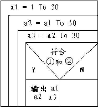 在三个女孩的年龄范围内,从他们年龄的所有可能方案中自然就能找出那个可能的范围。这要用到三个年龄的循环。范围内怎样找出我们最需要的呢?通过上面所列的条件就可完成了,最重要的一个是她们年龄乘在一起得到2450,教授的年龄也可看做一个条件,但有了上面关于人的最大年龄的假设,这个条件还是不能忽略的,最大假设是30,三个人90岁,但三个人年龄和的两倍将达到180,这应该是不可能的,常识中最大的值是120岁。所以在题中用到的两个条件如下,必须两个条件全部符合时才是我们要的结果:
