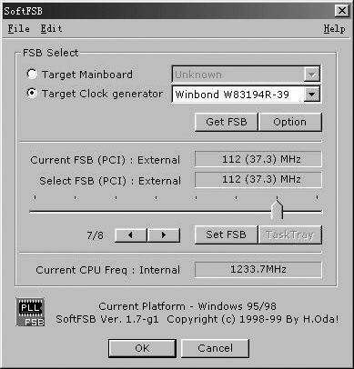 在FSB Select下有两个选项:Target Mainboard(主板的厂家或型号)和Target clock generator(时钟频率发生器的型号)。如果你知道主板型号,就可以在上面的选项中选择你的主板型号,如果列中没有你的主板型号,那就可以在下面的“Target clock generator(时钟频率发生器的型号)”中,选择你的时钟频率发生器的型号,如图5中的时钟发生器型号为Winbond的W83194R-39(时钟发生器一般在跳线或者DIP开关附近,大家可以具体查看)。以上两个选项只要设置好一个,接下来就可以超频了。接下来“Get FSB”,将会获得现有CPU的外频,同时可以对外频进行调整的标尺栏变成了黑色。SoftFSB提供的外频与主板所提供的相同,用户的主板支持的外频数越多,SoftFSB所提供的调整刻度也会相应地增多(图5)。下面我们就利用滑杆对CPU外频进行调整,设置完成后单击“Set FSB”按钮,系统便可以在不用重启电脑的情况下超频。