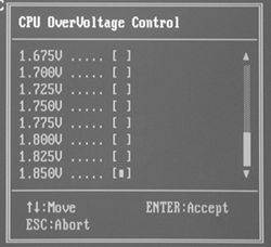 如果通过上面的系统稳定测试,发现系统不太稳定时,我们不防给CPU提高一点工作电压,这样做可以使超频后的系统变得稳定一些。如通过BIOS设置来调节电压。