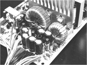 航嘉的多数电源采用的是无源PFC(图7),而宽幅王则采用了有源PFC(图8)。有源PFC电路中往往采用高集成度的IC,采用有源PFC电路的PC电源可以得到高于0.99的线路功率因数,并具有低损耗和高可靠等优点,输出不随输入电压波动变化,因此可获得高度稳定的输出电压;采用有源PFC的电源不需要采用很大容量的滤波电容。