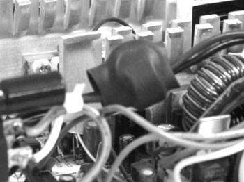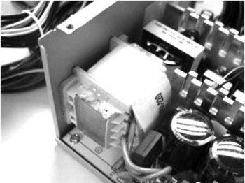 图10中黑色的“结”是一个磁环。电源内部有一些线圈,电流通过时会产生交变的磁场并向外辐射,而这个磁环就是来抵消磁场产生的电磁辐射的。其实在一些做工很不错的机箱中也可以见到这个东西。