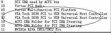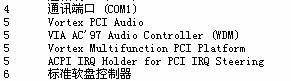 笔者首先彻底屏蔽声卡和USB设备以及USB Keyboard,再重新安装系统、DirectX8.1和Aureal8820的英文驱动(笔者安装的是4.06.00.1187版本),然后安装VIA Hyperion 4in1 448v驱动,重启以后安装新的VIA PCI补丁,这时进入游戏,干什么都没有问题了。接着笔者重启电脑,把USB设备和USB Keyboard打开,查看IRQ设置如图1: