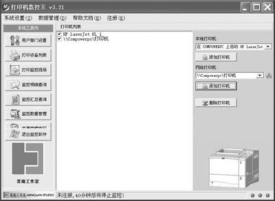 使用中,笔者感觉到打印机监控王的功能相当强大而且非常实用,可惜的是试用版本虽然在功能上没有任何限制,但每次只能运行40分钟,时间一到就无法保存监控数据库了。假如你使用的是Windows 9x/Me操作系统,那么将无法监控打印页数、纸张名称、方向等内容;假如网络打印机是从Windows 9x/Me共享出来的话,上述内容也无法监控,而且IP地址和电脑名称也无法监控。