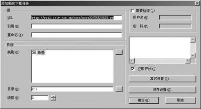 和网际快车相似,影音传送带也有多种下载链接添加方法:在浏览器右键菜单中选择“使用影音传送带下载”;直接在浏览器中拖动下载链接到软件悬浮窗中;复制链接地址,然后在主界面中单击工具栏中的“添加”按钮等。添加下载链接后,软件会弹出一个对话框(图2)。