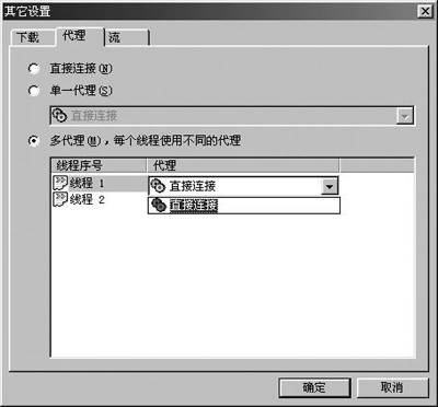 4.影音传送带同样支持代理设置,不过它的代理设置功能更强大,允许用户让下载任务每个线程使用不同的代理服务器,非常适合那些只允许每个IP只能有一个连接的站点,彻底突破某些站点的连接限制。在下载任务添加对话框中单击“代理设置”按钮,选择“多代理”选项,然后就可以点击每个线程后面的代理列表进行选择(图4)。