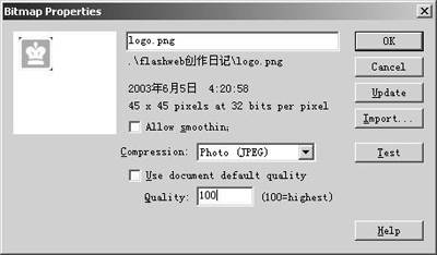 3.将Layer1图层改为Logo,点击File\Import导入logo.png图片,在Library面板中双击图片角色,打开Photo Properties面板,将图片设置为质量100的不压缩形式,如图4所示。