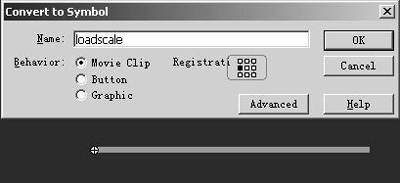 5.新建一个图层,图层名称为loadscale,绘制一个无边框矩形,色彩名称为loadscale,绘制一个我边框矩形,色彩为橙色,选中后,按F8键转换成Movie Clip,注意将对齐方式选为左端为中心点对齐,如图6所示。在Properties面板的Instance Name项中,输入影片剪辑的实例名称为loadscale。