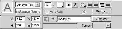 7.使用文字工具,在Properties面板中将文字属性选为Dynamic Text动态文本方式。然后在Var输入框中,输入动态文字的变量为Loadbytes,如图7所示。然后在已装载字节的文字后面拖出一个文字框。