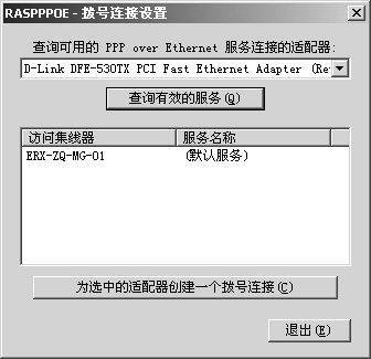 7.安装完后,单击“开始→运行”,在“运行”框里输入“raspppoe”,出现“RASPPPOE-拨号连接设置”窗口(图2),在“查询可用的PPP over Ethernet服务连接的适配器”下选择连接ADSL Modem的网卡,再单击“查询有效的服务”,在中间将显示有效服务名称,选中它,再单击“为选中的适配器创建一个拨号连接”,桌面上就会出现一个拨号连接的快捷方式。