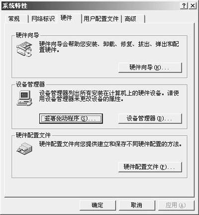 在“我的电脑”单击右键,选“属性”,在“系统属性”窗口选“硬件”选项卡(图3),单击“签署驱动程序”,在“驱动程序签名选项”中选中“忽略-不论有没有数字签名,安装所有文件”,然后重新安装。