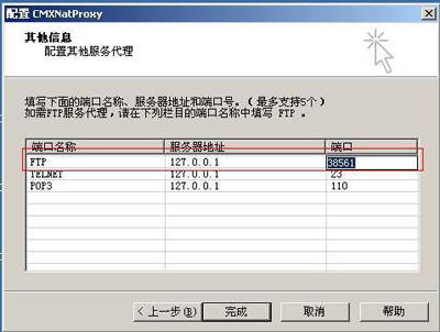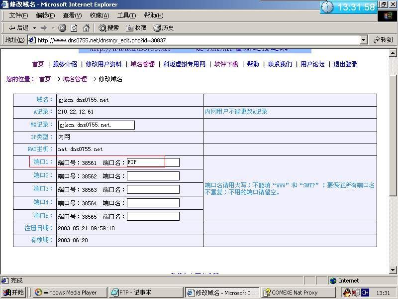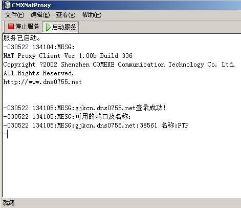 首先到http://www.dns0755.net/download.php,选择相应的操作平台下载。针对本文所讲的情况,这里选择下载Windows平台的内网客户端,解压缩即可使用。使用前必须要到该页注册一个账号(http://www.dns0755.net/register.php),注册后在“域名管理”处申请一个二级域名,该域名是以yourname.dns0755.net形式表现的。启动该软件,会出现配置窗口,在第二项中把你申请到的域名填写进去,代理服务器的访问密码就是你注册时的密码,然后点击“下一步”,出现WWW信息对话框,略过,直接点击“下一步”,出现SMTP信息对话框,同样略过,点击“下一步”,最后出现其他信息的对话框,在这里需要填写FTP的端口,该端口并不能自己设置,需要到域名申请页面去设置端口号(图1),笔者的FTP端口是38561。然后将属于你自己的端口填入其他信息对话框中(图2),点击完成,然后询问是否启动服务,点击确定(图3)。