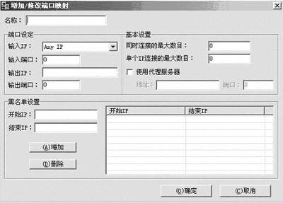 2.在局域网主机上安装端口映射软件PortMap 1.5中文版,打开程序后,按“增加”,弹出如图所示窗口。
