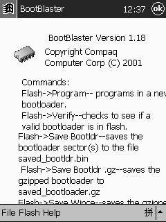 如果通过专用的ROM更新界面进行升级,则有可能牵涉到一些版权问题,但是用户互相之间的非商业交流还是允许的。以Compaq iPAQ3630为例,我们也可以采用这种方法来升级。当我们在网上下载都升级ROM之后,首先在关闭ActiveSync的情况下按住POWER和ACTION键不放,同时按下软启动(Reset),随即释放Reset,此时专门用于ROM刷新的“鹦鹉”界面就会出现。随后执行HOST11.EXE,ROM刷新就会开始执行。当然,不同的PDA有不同的刷新界面呼叫方法,如联想的XP系列采用“Home+Rest”快捷键唤出Bootloader程序,因此大家还是要查阅产品的说明书。