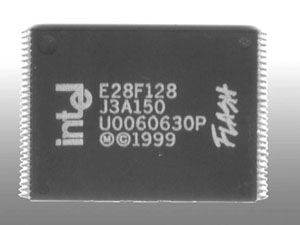 iPAQ3630的ROM芯片有两块,因此我们必须购买两块16MB的FlashROM。尽管iPAQ3630可以兼容各种FlashROM芯片,但是建议大家使用Intel 28F128(图6),其价格大约为250元(两片)。热风枪是拆卸的得力工具,它可以帮助我们快速地将ROM芯片拆下,同时不损伤周围的电路。接下来的事情就更为简单了,使用电烙铁将两块Intel 28F128 FlashROM焊接上去并取出焊渣即可。