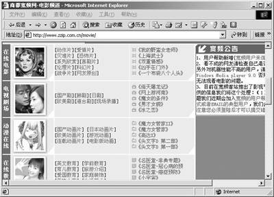 随着宽带走入家庭,网络视频已经不再是梦想,各种网上影院也应运而生,如商都宽频网-电影频道(http://www.zzip.com.cn/movie),它为用户提供最新电影的资料片、经典国内外影片在线收看等。但是,这类影院一般都是收费的,免费资源不是很多,所以要想免费,最好是到为用户提供宽带的ISP提供的在线影院去观看。