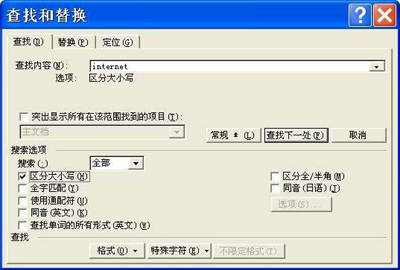 比如要查找文档中的“internet”一词,在窗口中的“查找内容”框中输入“internet”,然后单击“查找下一处”按钮,就会搜索到需要的文字。如果需要继续查找,再单击“查找下一处”按钮就可以了。