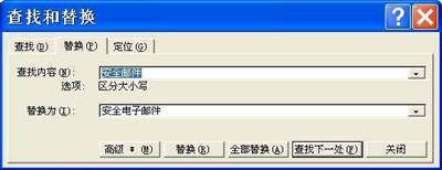 需要替换文档中的某些内容时,单击“查找和替换”窗口中的“替换”选项卡(或者按下键盘上的“Ctrl+H”组合键),打开“替换”设置窗口(图2)。然后在“查找内容”框中输入要搜索的文字,比如“安全邮件”,在“替换为”框中输入替换的文字,比如“安全电子邮件”。然后单击“替换”按钮,就可以完成替换了。如果需要将文档中的所有“安全邮件”替换为“安全电子邮件”,可以单击“全部替换”按钮。