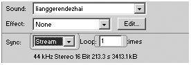 2.选中music图层的第1帧,在Properties属性面板中的sound音乐角色属性部分,将Sync下拉选框选为Stream数据流格式,然后在Loop循环输入框中输入数字1,让音乐只循环播放1次(图2)。
