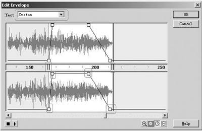 3.点击Edit按钮,打开Edit Envelope对话框,将两个声道中间的竖杆拖动到165附近,然后将设置音量的拖动点,拖动到如图3的位置。