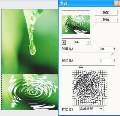 5.点菜单“滤镜→扭曲→水波”,在弹出的对话框中设置数量为91,起伏为7。这里根据自己的需要来调节,效果可以从预览框中可以看到。设置好后点确定结束设置。按键盘上的“Ctrl+D”键取消选区(图4)。