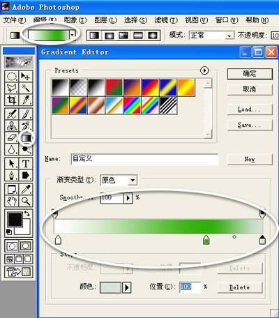 2.点工具面板中渐变工具,在渐变工具的属性条中点“渐变设置”框,在弹出的设置框中设置渐变效果如图7(对图6的基本关系理解了,这一步就知道怎么设置了)。