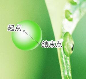 3.在选区内拉出一个圆形的渐变效果,注意在拉出渐变效果的时候要注意球体的亮面和暗面的分布。起点的位置就是球体的高光位置,结束点的位置就是球体的反光部位。一般反光的亮度比较弱,拉出渐变的方法可参考图8。一次不满意可多次实验,直到满意为止。