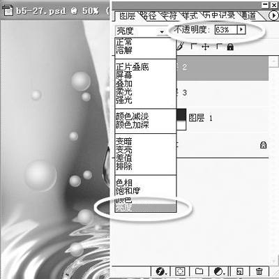 5.现在做出的效果只能说是一个个的小球体,不像气泡效果。别急下一步我们只要进行一项简单的设置就能改变过来。在层面板中的模式效果中选择“亮度”模式,不透明度设为63%(图10)。现在再看看是不是很透明,不在那么生硬了?