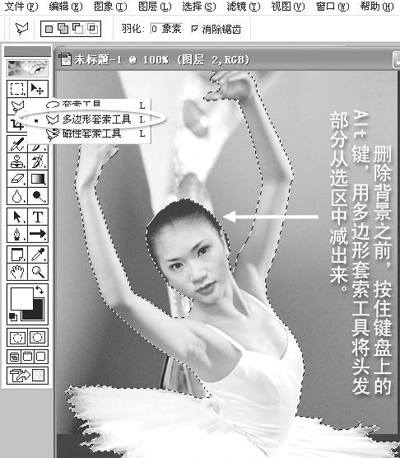 注意:人物的黑色头发是需要保留的,也被选取了。要将选取的这部分剪去,有个小技巧,按住键盘上的Alt键,然后用多边形套索工具,小心地将头发部分勾选。当勾选闭合时,头发部分就被从选区中剪去了(图12)。