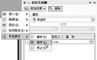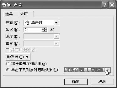 4.将声音暂停控制设定为用暂停按钮控制。继续选择小喇叭图标,在“自定义动画”窗格单击“添加效果/声音操作/暂停”(图2),在“自定义动画”窗格下方出现了暂停控制格,双击控制格,出现“暂停声音”设置对话框,单击“触发器”按钮,在“单击下列对象时启动效果”右侧的下拉框中,选择触发对象为“暂停”按钮(图3),单击“确定”按钮。